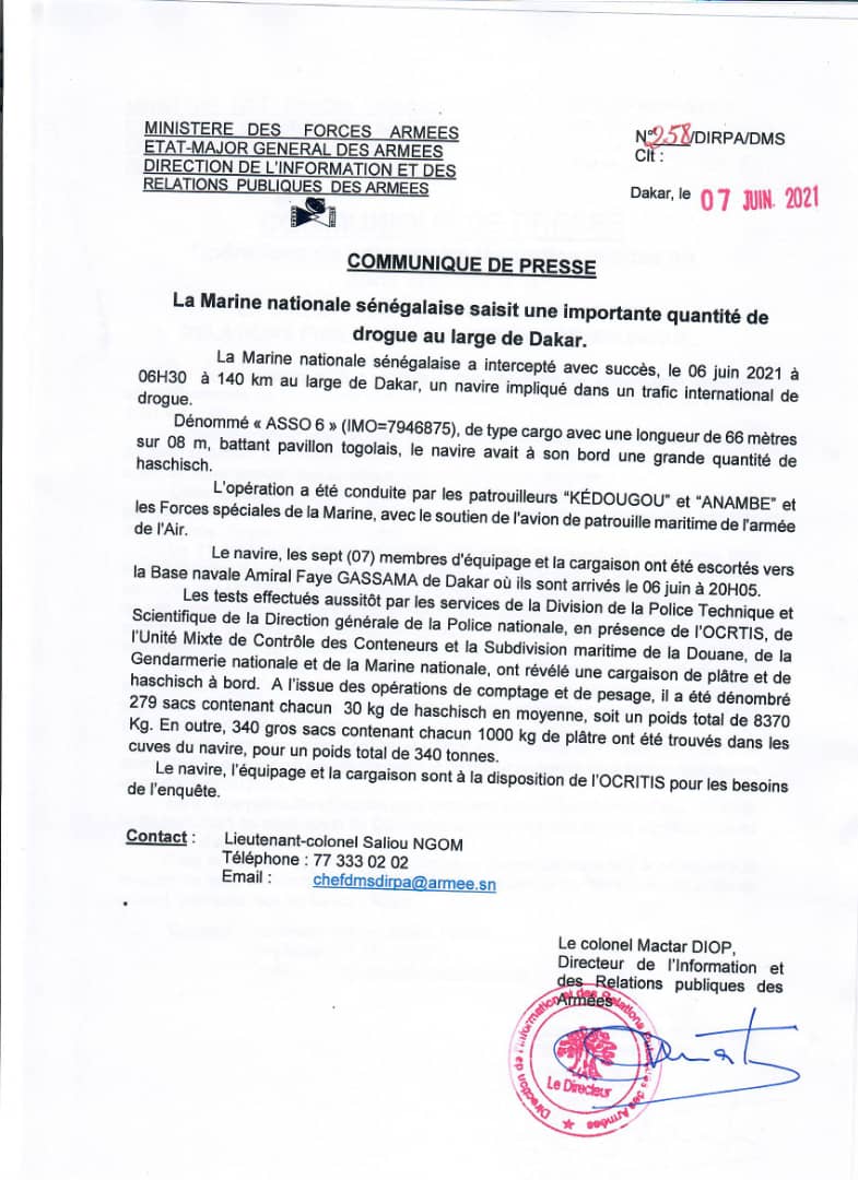 La Marine nationale sénégalaise saisit une importante quantité de drogue au large de Dakar