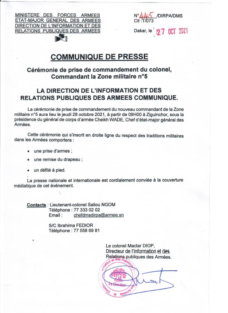 Cérémonie de prise de commandement du colonel,Commandant la Zone militaire n°5